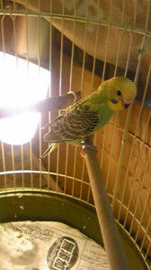 萌黄は止まり木に止まる様子もさまになっていますが、茶々はまだおっかなびっくりです。