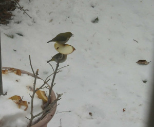 メジロとヒヨドリ 2010年2月7日野鳥空太郎 庭の姫林檎の植木鉢に林檎を刺した枝を立てておいたら、メジロとヒヨドリが食べに来ました。なかなかメジロが来ることはないのですが、雪が降ったせいでしょうか。 他にも一羽見慣れぬ鳥が来たのですが、写真を撮ることは出来ませんでした。